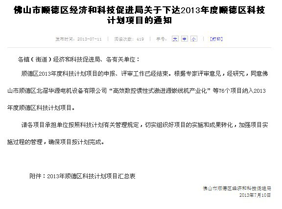 7月12號,佛山市順德區北滘華源電機設備有限公司籠罩在一份濃濃的喜悅當中,因為今天本公司正式收到來自佛山市順德區經濟和科技促進局關于下達2013年度順德區科技計劃項目的通知。順德區2013年度科技計劃項目的申報、評審工作已經結束。根據專家評審意見,經研究,同意佛山市順德區北滘華源電機設備有限公司“高效數控慣性式激進源嵌線機產業化”等76個項目納入2013年度順德區科技計劃項目。這個通知體現了國家和地區對本公司的關注和支持,極大的鼓舞了本公司的士氣,也為本公司的研發打下了物質基礎。